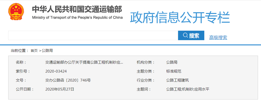 但是,今日机制砂行业迎来新的曙光,为解决河砂紧缺局面,交通运输部发布《交通运输部办公厅关于提高公路工程机制砂应用水平的通知》,对机制砂石质量给出具体参考标准,各地可结合实际情况在应用过程中制定实施细则,不断加强机制砂生产与应用过程中的质量管控,确保机制砂质量。